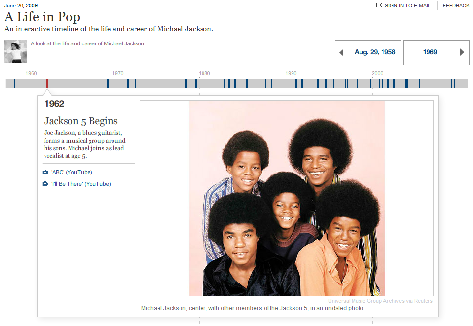 The King of Pop passed away two and a half years ago and while his fans still mourn his untimely death, his passing continues to make headlines due to the trial of Dr Conrad Murray. The ‘Life in Pop’ visualisation is interactive and covers the major points in the star’s life from birth to death, from hit to hit.