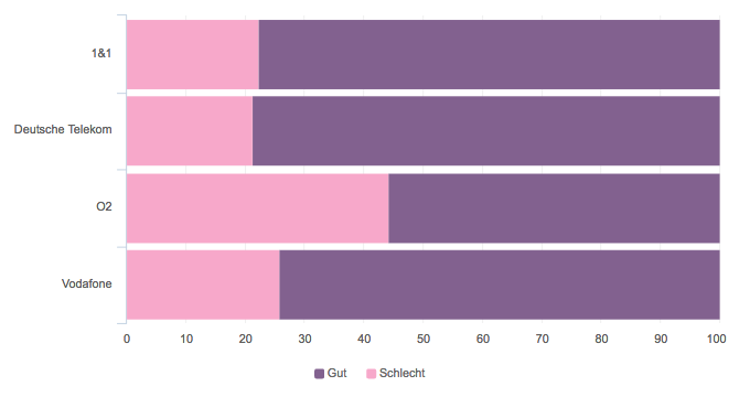 Das nachfolgende Chart zeigt eine Wettbewerbsanalyse in der Telekommunikationsbranche. In der Analyse wurden die Äußerungen zu den Kundenservices näher untersucht und die Erwähnungen in positive und negative Äußerungen eingeteilt. Ein Vergleich zeigt, dass im Vergleich zu den anderen Anbietern der Kundenservice von O2 am schlechtesten abschneidet.