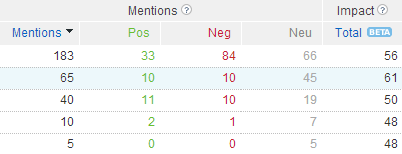 Der Score ermöglicht es, PR und Kommunikationsteams einfach und schnell die wichtigsten Mentions zu finden, die eine Unterhaltung im Web anführen, ganz gleich aus welcher Quelle sie kommen. So finden Sie z. B die Rückruf-Geschichte, die sich zunächst auf Nachrichtenseiten verbreitet, dann aber in Soziale Netzwerke überspringt. Oder der Beschwerde-Tweet, der von Blogs aufgegriffen wird. Der Impact Score hebt diese Unterhaltungen hervor, so dass Sie schnell darauf reagieren können.
