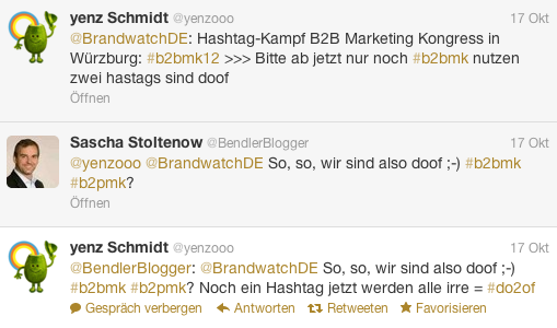 Und wenn Sie jetzt denken „Na, wenn das nur so weniger Tweeter waren, werden sie sich ja zumindest über den Hashtag einig gewesen sein…“ – weit gefehlt. Denn es gab ein regelrechtes Wettrennen um die Hashtags #b2bmk und #b2bmk12: