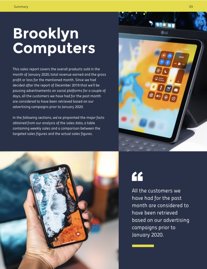 The stock photos interlaced with the text areas help to provide a visual balance in the report, making the content more visually appealing and easy to read. The trick is not to over-do it or use confusing or distracting images. You want readers to focus on the information.