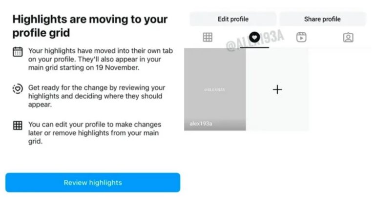 Instagram is shifting Story highlights from the bubbles above profiles to a new tab and the main profile grid. App researcher Alessandro Paluzzi shared a preview of the updated grid back in August, but details on how highlights will appear within it remain unclear.