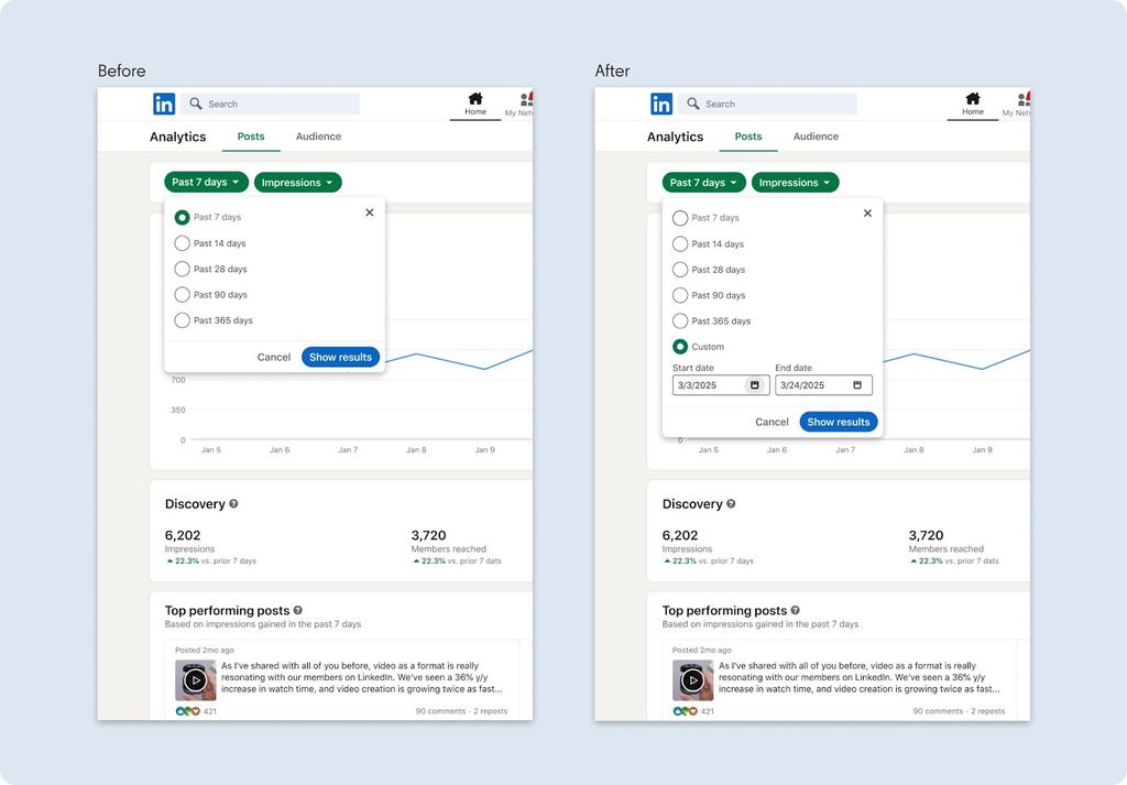 Users on LinkedIn now have more control over how they track content performance. Instead of being limited to preset timeframes, they can select custom date ranges to analyze impressions and engagement. Newsletter insights have also improved, with the addition of two new metrics—Email Sends (the number of times a newsletter was sent via email) and Open Rate—making it easier to understand how far content is reaching and how readers are responding.