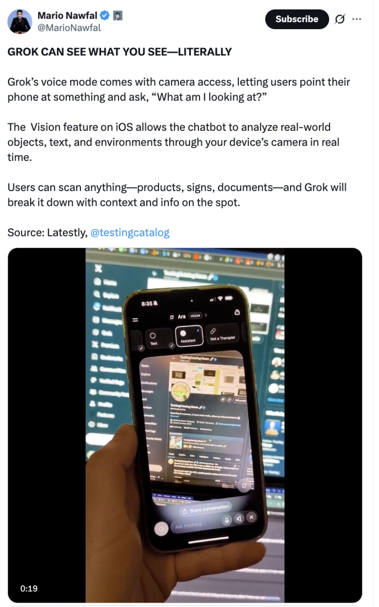 X has introduced Grok Vision, a new feature in its Grok AI chatbot that brings real-world object recognition into the mix. Users can now point their phone at items like products, signs, or documents and ask questions. For example, “What am I looking at?” The tool is designed to help users quickly interpret and interact with their surroundings using AI-powered visual understanding.