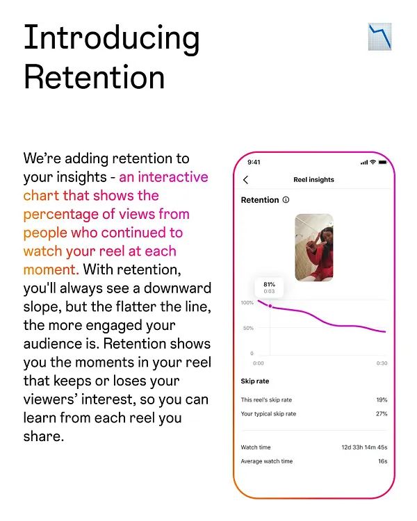Instagram is giving creators more insight into how their Reels perform with a new retention chart. The metric shows exactly when viewers drop off, helping creators understand what keeps audiences engaged, or what doesn’t. Instagram notes that a declining curve is completely normal, so don’t panic if your Reel loses viewers along the way.