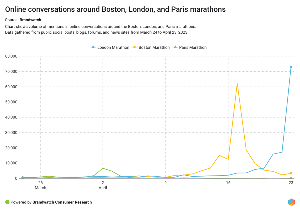 How did the Paris Marathon, London Marathon, and Boston Marathon fare online?