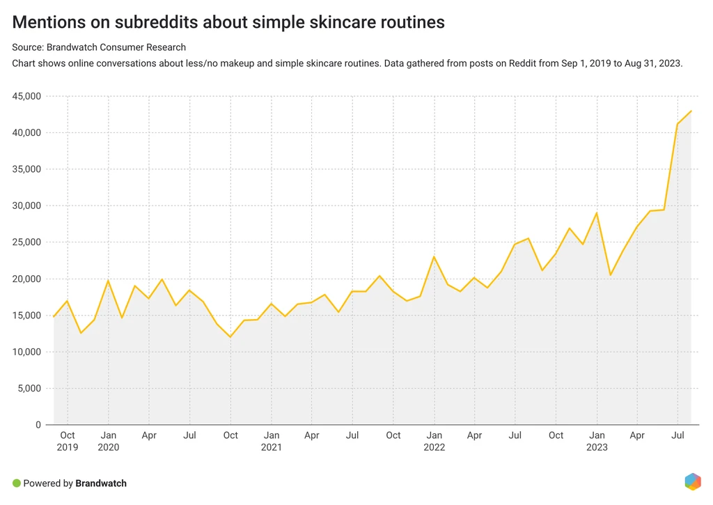 Online conversations on Reddit increased by 39% from August 25, 2022 to August 24, 2023 compared to the previous 12 months. 30% more people on Reddit are talking about simple skincare routines and wearing no or only minimal makeup. They post photos of themselves in subreddits like r/selfie to encourage others or to discuss the best products for a simple makeup look.