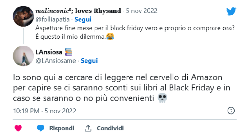 La maggior parte delle conversazioni su Twitter riguardo al Black Friday avvengono infatti da parte di utenti piuttosto che da canali di proprietà di giornali o altre organizzazioni.