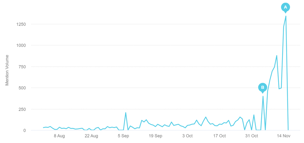 Le menzioni raggiungono un picco di oltre 1250 in un solo giorno durante il 14 di Novembre, esattamente 11 giorni prima dell’evento.