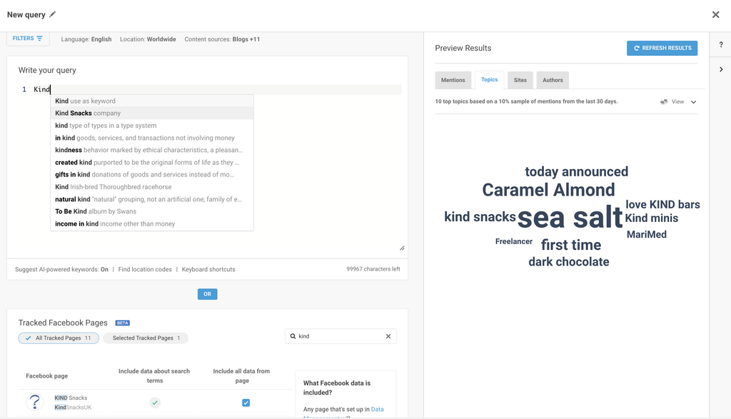 This highly popular feature in our quick search tool has now been brought into the Query builder. Now when you start typing, you can select a recognized entity and let our AI find relevant mentions for you, whether you're analyzing a brand with a common word as its name or you want to search for conversations about a broad topic like 'running' or 'the environment'.
