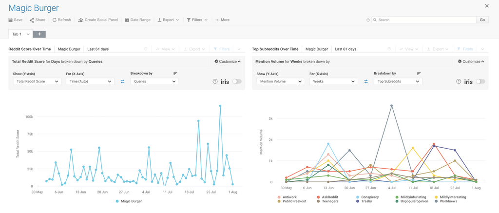 We've continued to improve how you can visualize and surface insights from our full firehose coverage of Reddit data. Now you can chart over time by Total Reddit Score, Karma, and Total Subreddits. You can also break down your data over time by the top subreddits conversations are appearing in.