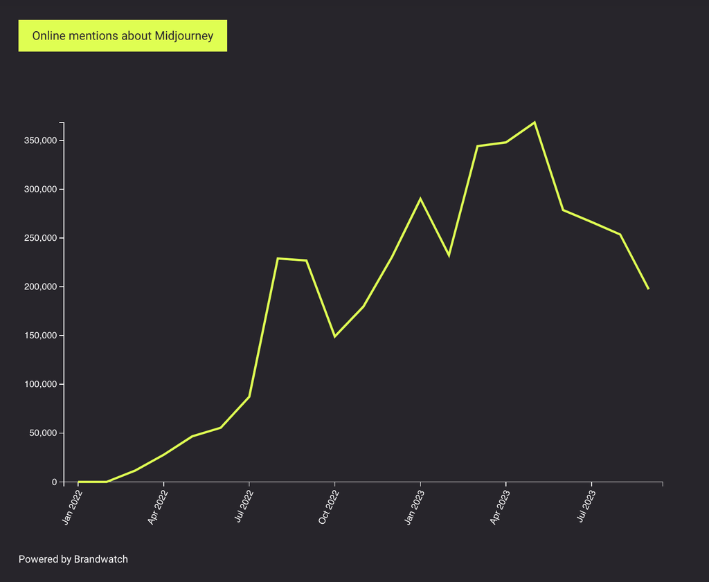 Looking at our tech query, we observed a fascinating surge in the field of AI and automation. Over the previous six months, there was a remarkable 43% increase in online social media mentions related to this topic. As we delved deeper into this conversation, we discovered a significant contributor to this growth: generative artificial intelligence program Midjourney.