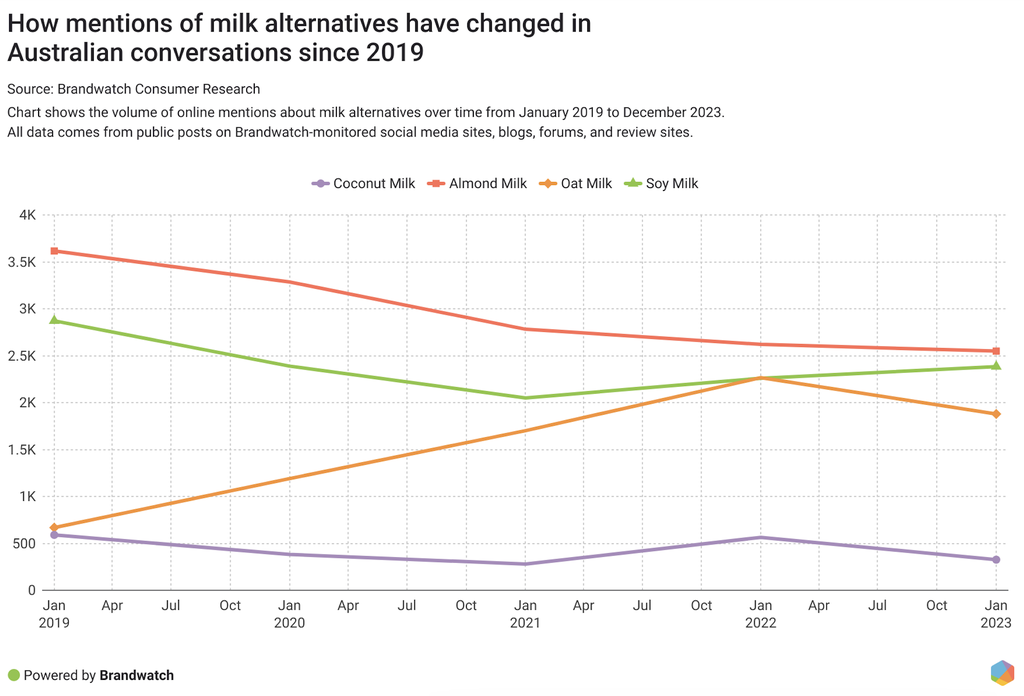 Milk alternatives have gained popularity across the globe in recent years – and this can be seen across social mentions in Australia, too. Whether you’re lactose intolerant, vegan, concerned about the environment, or have health concerns – there’s bound to be a milk alternative for you.