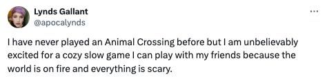 For some people, the ability to play with others is the defining characteristic that makes the game more enjoyable than others. For example, the tweet below is from someone who wouldn’t play cozy games alone, but enjoys them as a “vehicle for hanging out.”