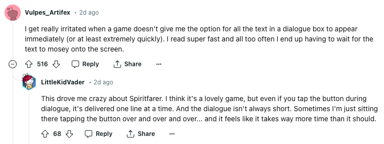 Another pain point for cozy game users is a bad user experience. From not showing all the dialogue in a text box at once, to an inability to save the game quickly, there are hundreds of people having conversations about what makes a game unenjoyable online (like this dedicated post in the r/CozyGamers subreddit).