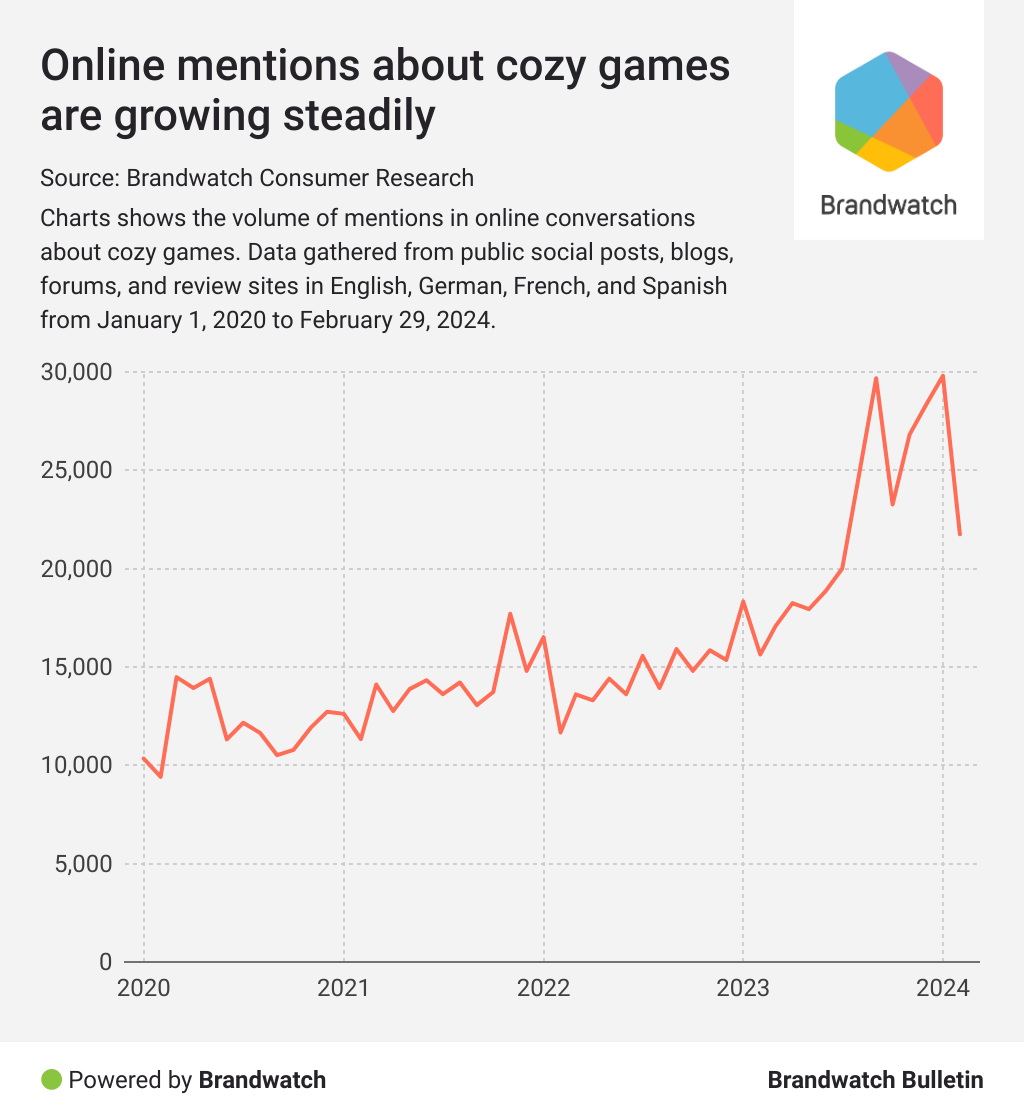 Not only has there been a significant increase in online conversations discussing cozy games, but an impressive 75% of sentiment-categorized mentions about cozy games were positive last year.