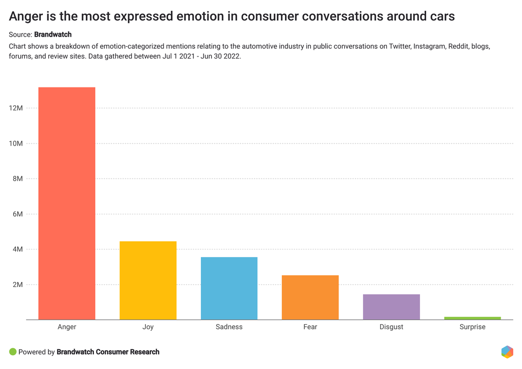 Looking at the emotions expressed shows that German-speaking car drivers are not at all thrilled about the idea of driving economically, which shows when comparing the sentiment to English-, French, Italian-, or Spanish-speaking drivers. This is mainly fueled by discussions of implementing a speed limit on German highways, which caused a lot of negative mentions.