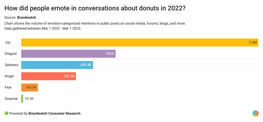 Looking at emotion-categorized mentions, joy was by far the most popular emotion in donut-related conversations on social. It appears that donuts bring people joy.