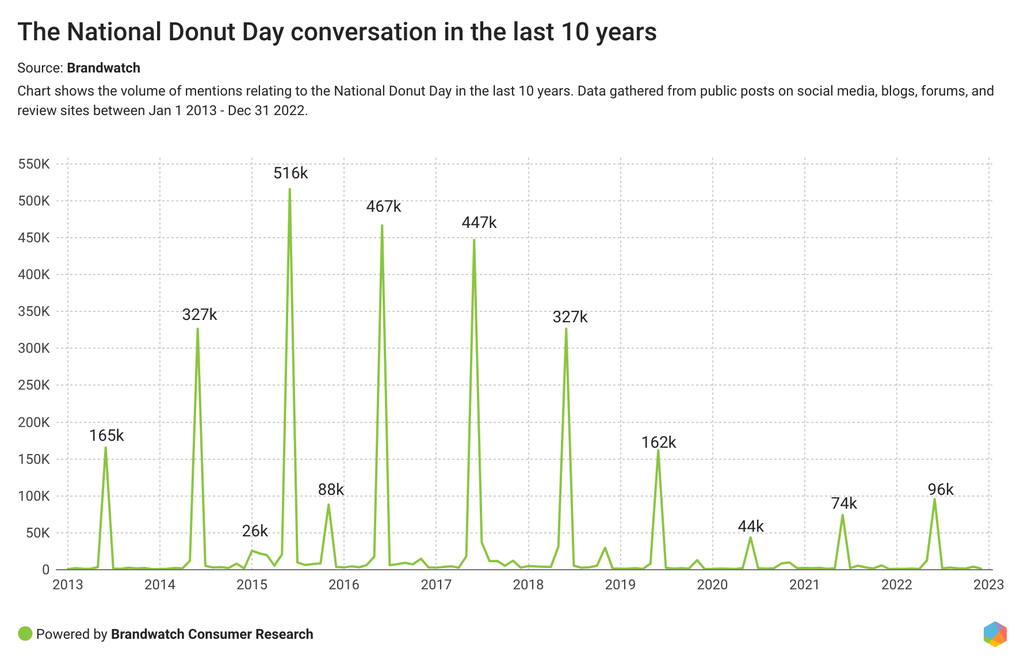 We used Brandwatch Consumer Research to analyze the donut conversation on social media in the last five years.