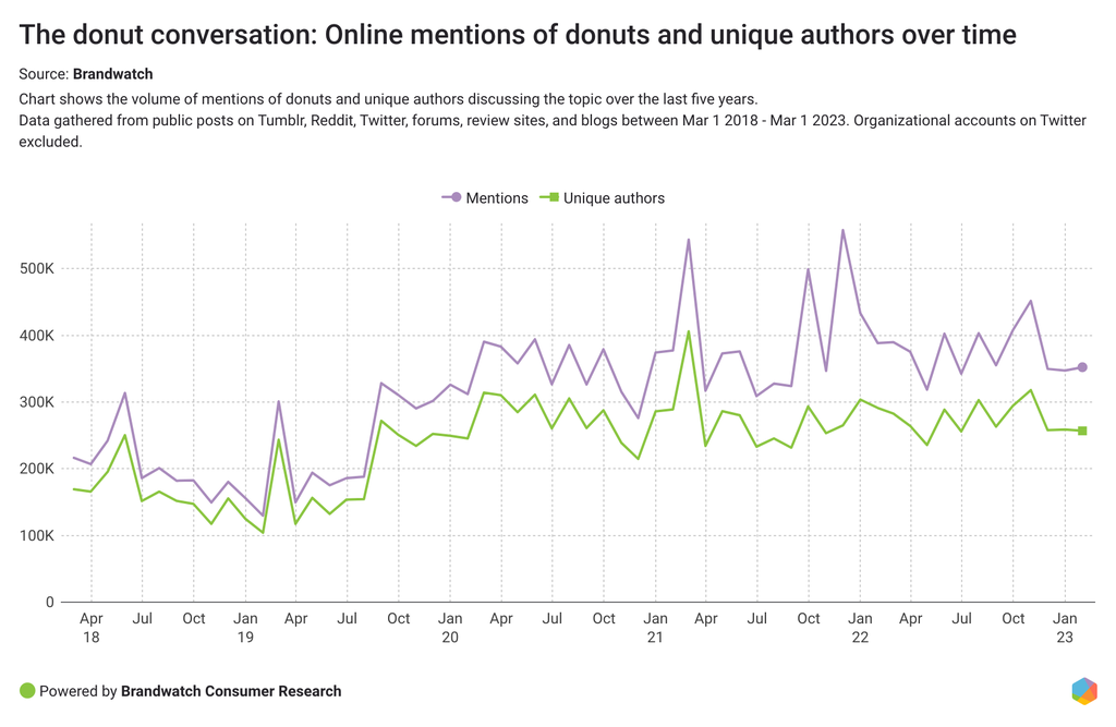 As shown on the chart, both the conversations relating to donuts and the volume of unique authors joining the conversation have grown since 2018.