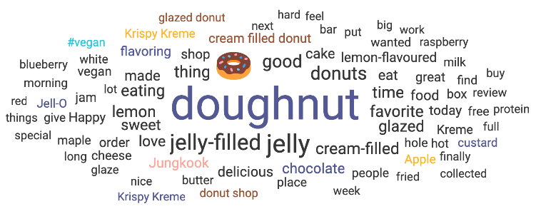 We visualized the most popular words and phrases in conversations mentioning donuts and flavors or toppings using a topic cloud.