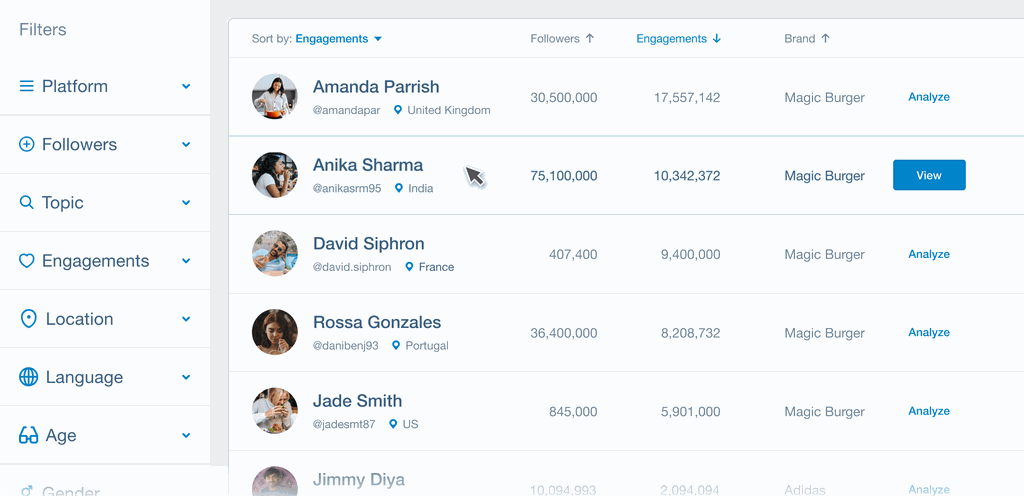 With Influence, you can filter creators by audience demographics, past brand partnerships, engagement trends, and even brand safety signals like mentions of controversial topics. This level of depth is impossible to achieve through manual searching alone.