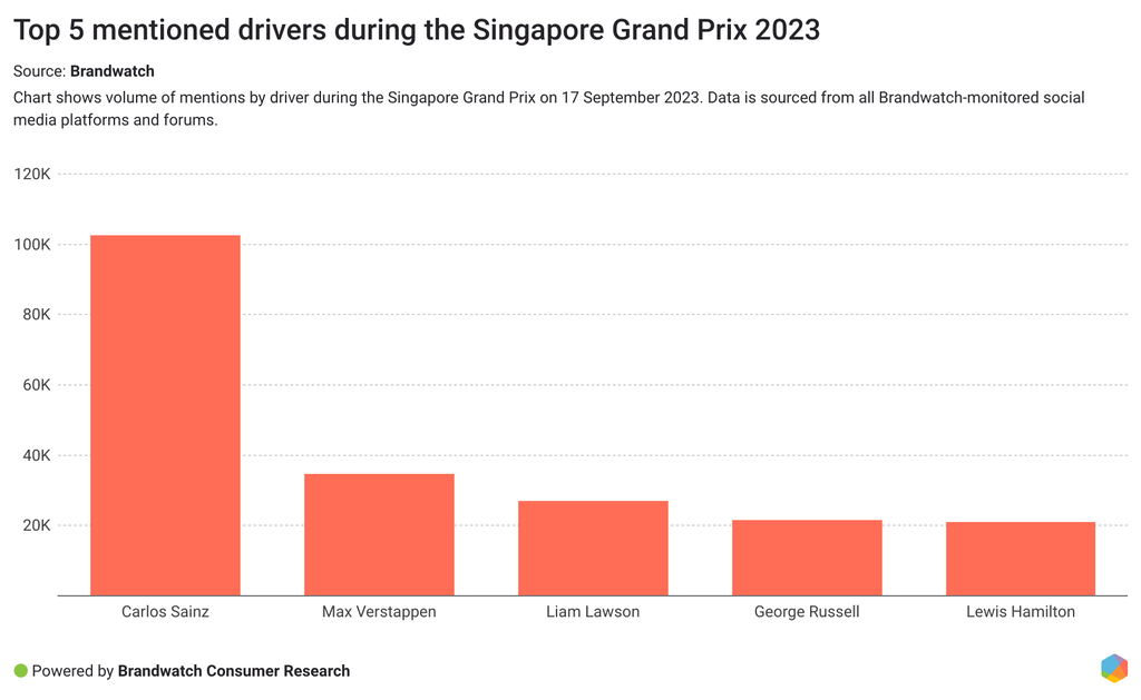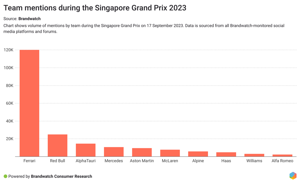 The most popular team during the 2022 race was Ferrari, who stole a third of all mentions. Up next were Red Bull and Mercedes, with 15% and 13% of mentions, respectively. The most popular drivers were Charles Leclerc, Max Verstappen, and Lewis Hamilton – with 19%, 16%, and 14% of mentions, respectively.