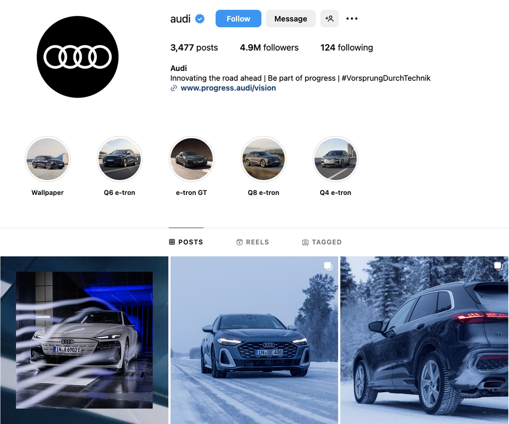 All its latest car models are showcased in the highlights section of Audi's Instagram profile. The cover photos have the same style, while the titles are understandable and uniform. They help the entire profile stay on brand.