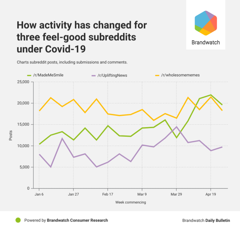 /r/Uplifting news was the first climber, rising at the start of March when lockdowns were implemented around the world. These Redditors posted about renewable energy, foodbank donations and falling death rates in Italy.