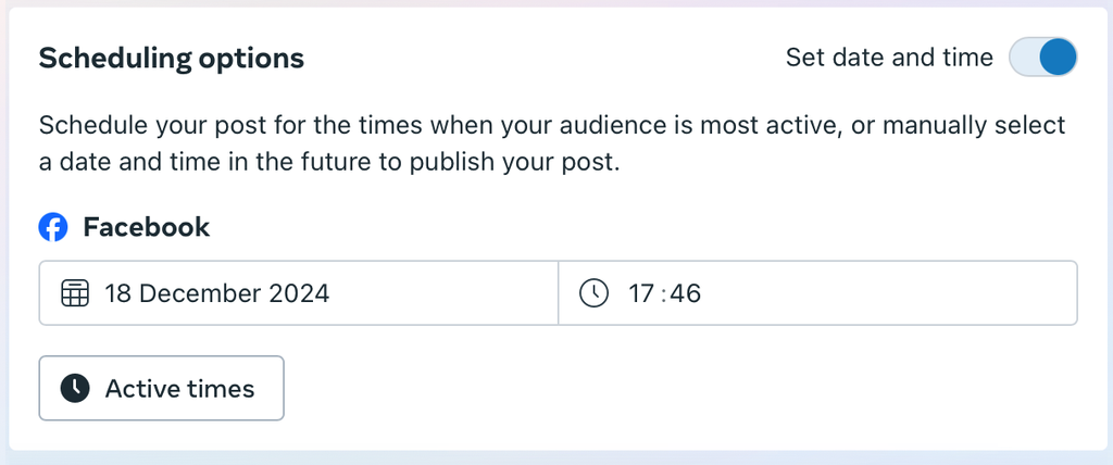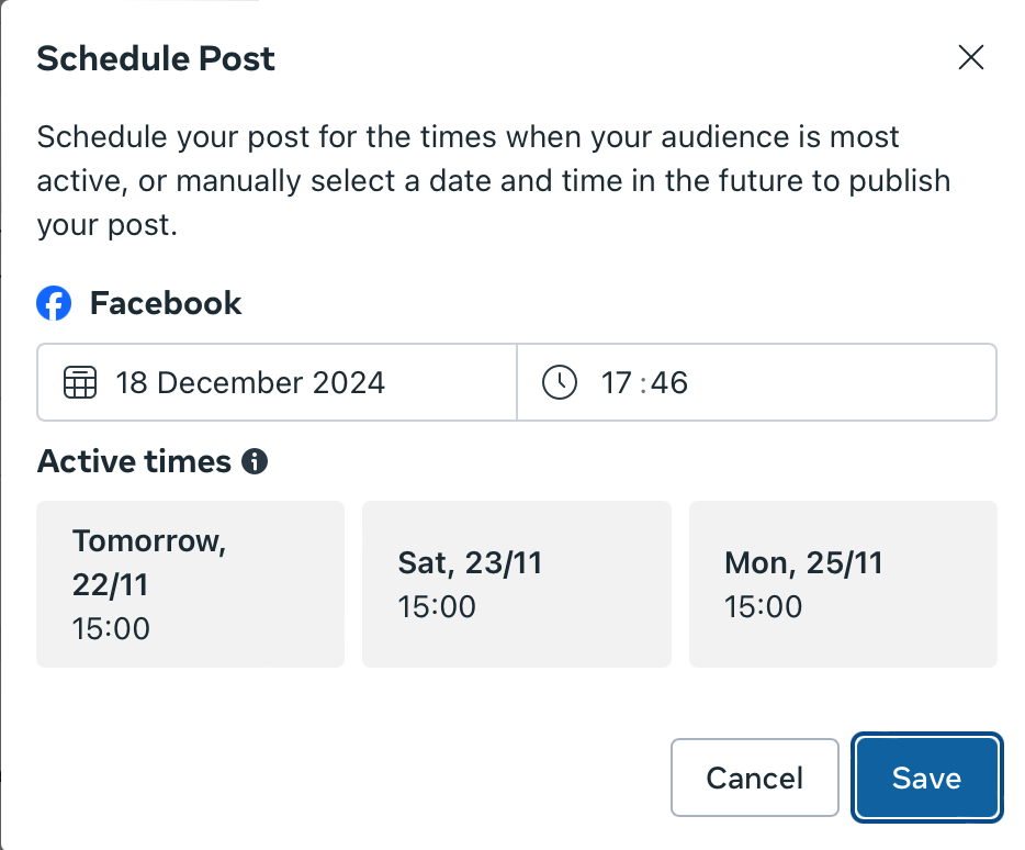 Use Facebook Insights or a third-party tool to find when your audience is most active. Facebook actually offers this service when you post on the Meta Business Suite. As you can see here, the algorithm suggests three "Active times" to choose from.