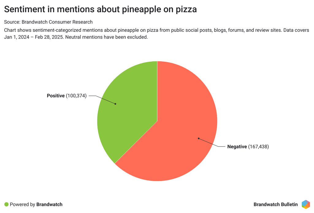 When diving into the sentiment on this topic, a large 61% of online mentions conversation were negative – almost two thirds of users expressed distaste for the topping.