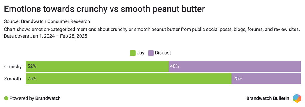 People are much more likely to express joy in posts about smooth peanut butter. But that doesn’t mean the debate is over – 3,500 individuals chime into this conversation every month.