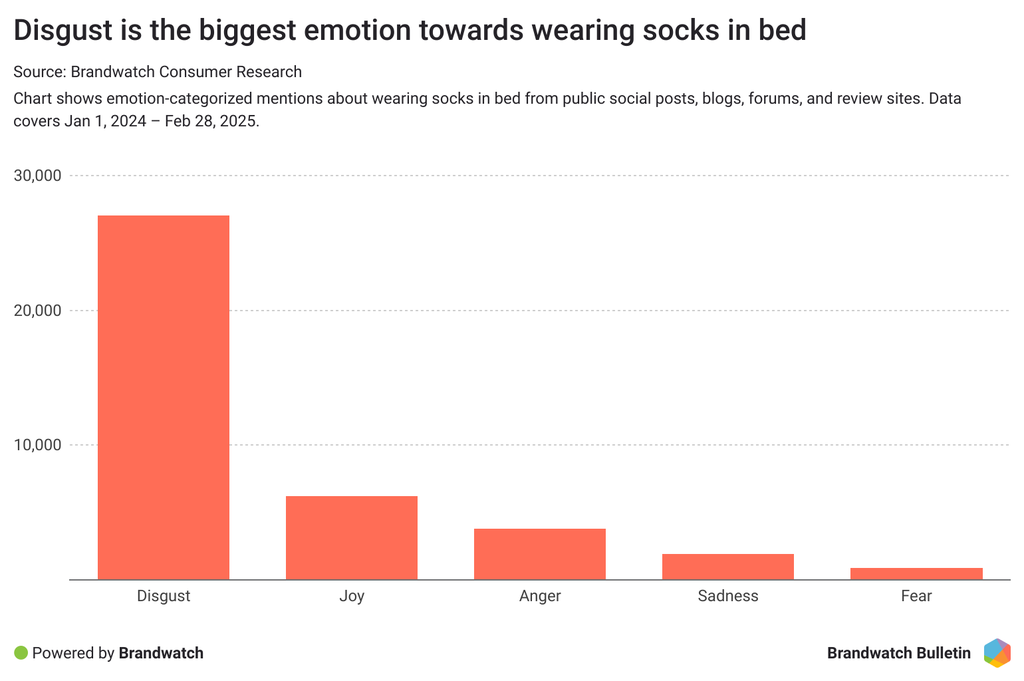 Well, online, opinion is pretty straightforward – socks in bed are a huge no-no. 68% of emotion-categorized mentions showed disgust.