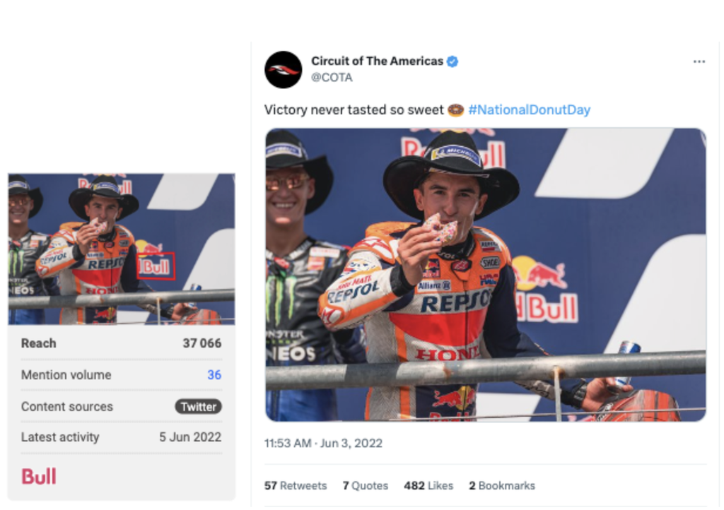 In this example, Brandwatch’s Image Insights detected the Red Bull logo in a viral race day moment, showing how the brand appeared in social media conversations.
