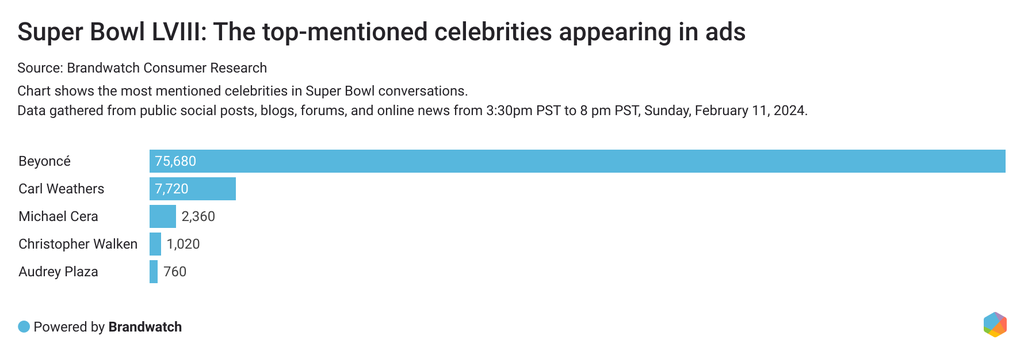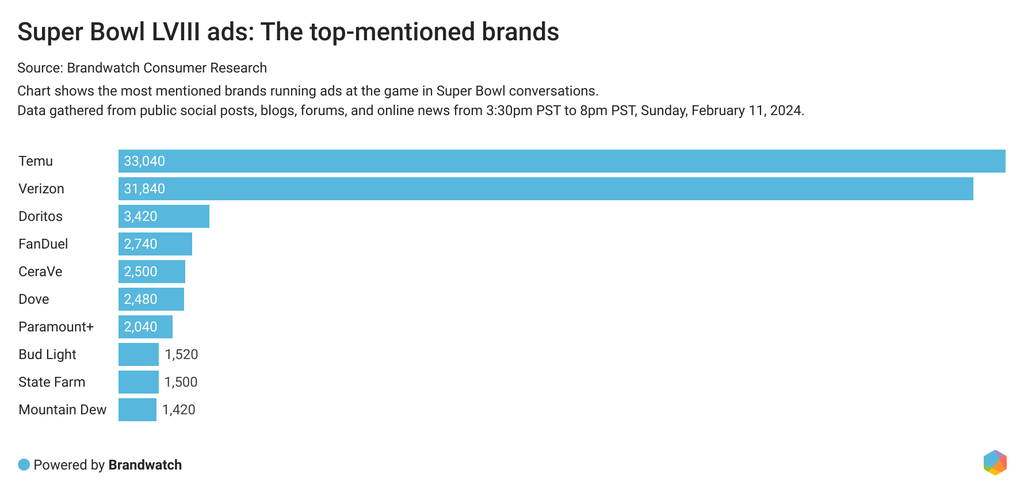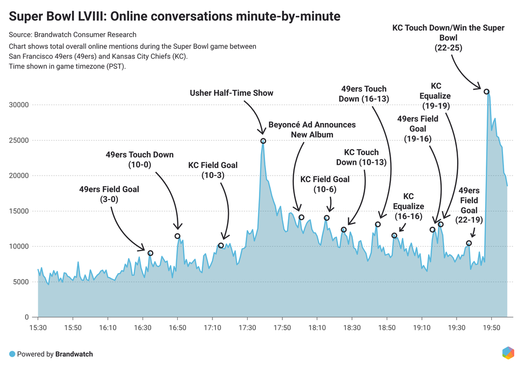Note on methodology: All data was collected from 3:30pm PST to 8pm PST, which is roughly the time frame of Super Bowl LVIII. All data comes from public social posts, blogs, forums, and online news mentioning the Super Bowl.