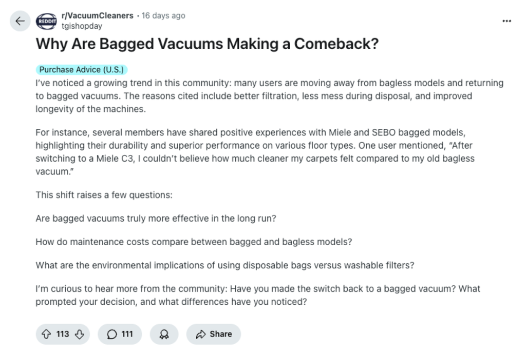 This Reddit post from r/VacuumCleaners reflects the growing consumer interest in bagged vacuum cleaners. Users are citing better filtration, less mess, and longer-lasting machines as reasons for switching back. This echos the wider trend seen in the Brandwatch data.