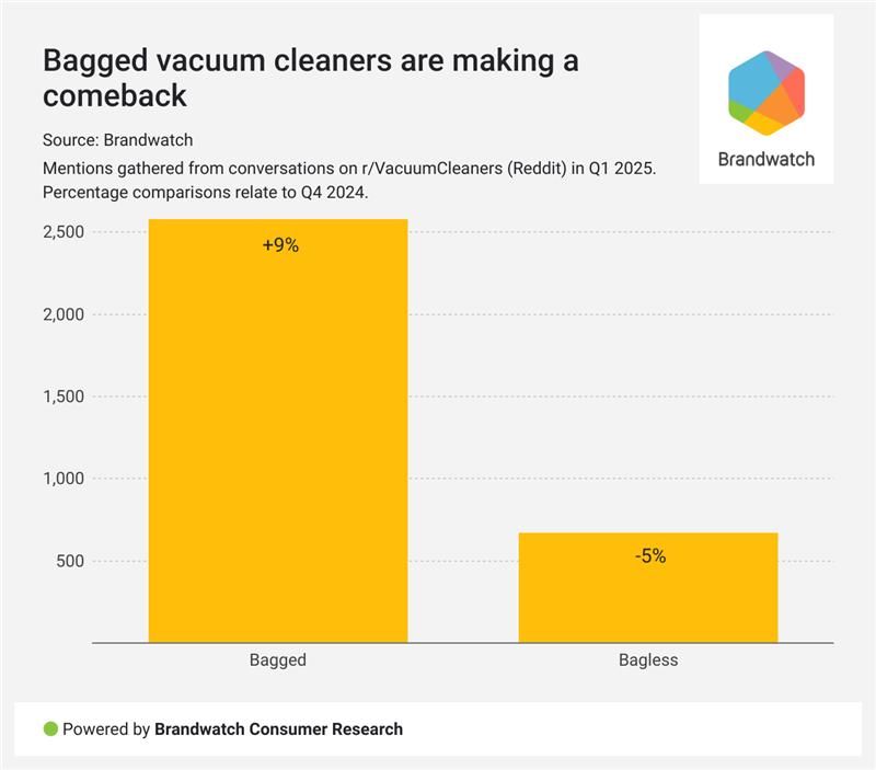 Posts and comments about bagged vacuum cleaners were up 9% from Q1 2025 to Q4 2024. Meanwhile, the conversation about bagless vacuum cleaners is significantly smaller and volume fell by 5% in the same period.