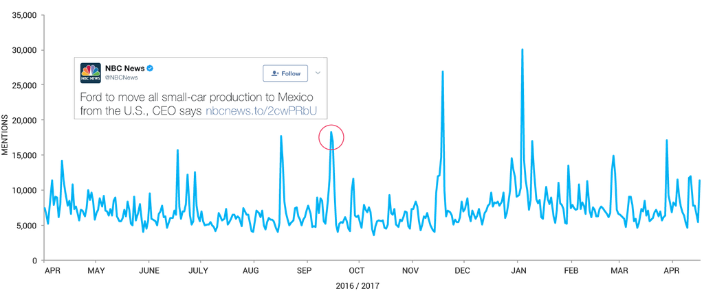 Jacob and the team at AOL were able to see that Ford’s announcement to open the Mexican plant in early 2017 ignited the social conversation.