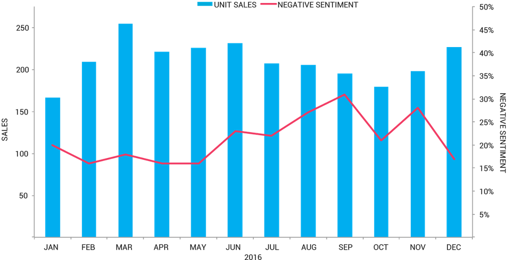 The data showed that high negative social sentiment in September 2016 was followed with low unit sales in October 2016. Seasonality should be considered, but the 2016 unit sales in October were much lower than the 2015 October sales. This suggests the need for further investigation as Ford’s announcement was likely to have a real impact on sales.