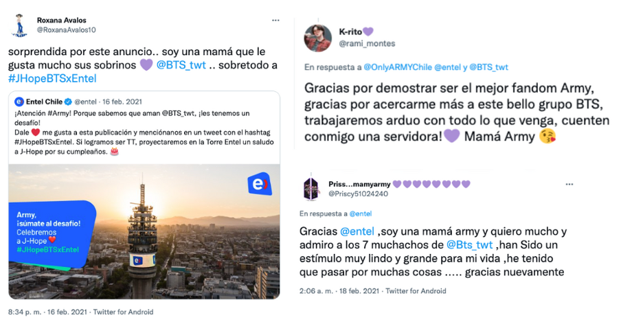 One of Entel's objectives, as mentioned above, was to enter a new market and appeal to young consumers, such as the BTS fan groups. Surprisingly, in addition to this audience, they also reached fans' mothers, who appreciated what Entel did for their children.