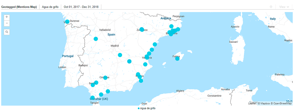 Geotagged mentions, which locate the places where conversations happen, allowed Thinketers to identify Catalonia, Levante, and Andalusia as the areas with the highest percentage of negative conversations about the taste of water.