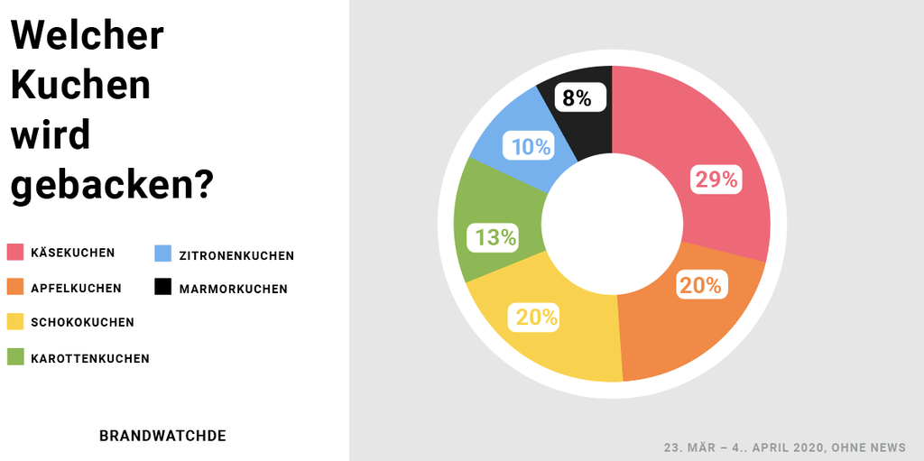 In unserer Analyse hat Käsekuchen mit 29% den größten Share of Buzz. Den zweiten Platz im Ranking belegen Apfel- und Schokokuchen mit jeweils 20%, gefolgt von Karottenkuchen (13%), Zitronenkuchen (10%) und Marmorkuchen (8%). Im Vergleich zur ersten Märzhälfte nahmen die Gespräche rund um Zitronen- und Karottenkuchen am meisten zu.