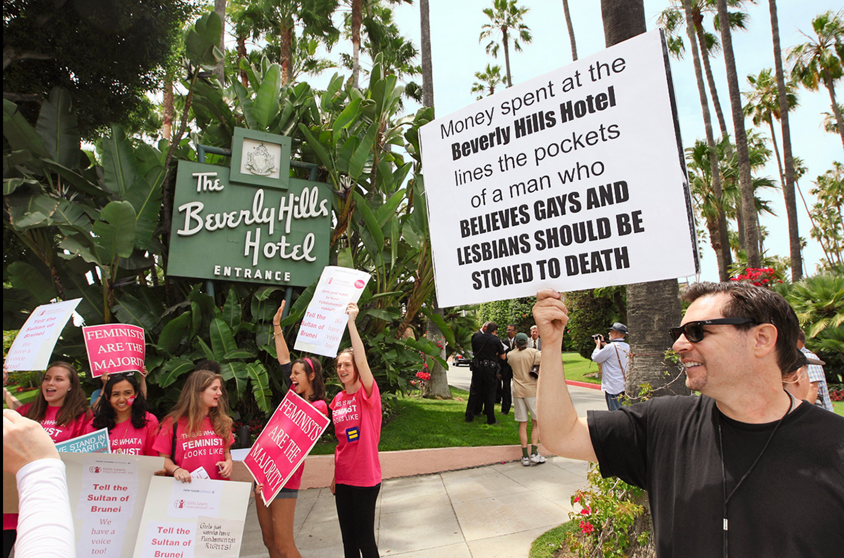 Daraufhin haben lesbische, schwule, bisexuelle und transsexuelle Gruppen eine lokale Kampagne organisiert, um das berühmte Beverly Hills Hotel zu boykottieren, da dieses dem Sultan gehört.