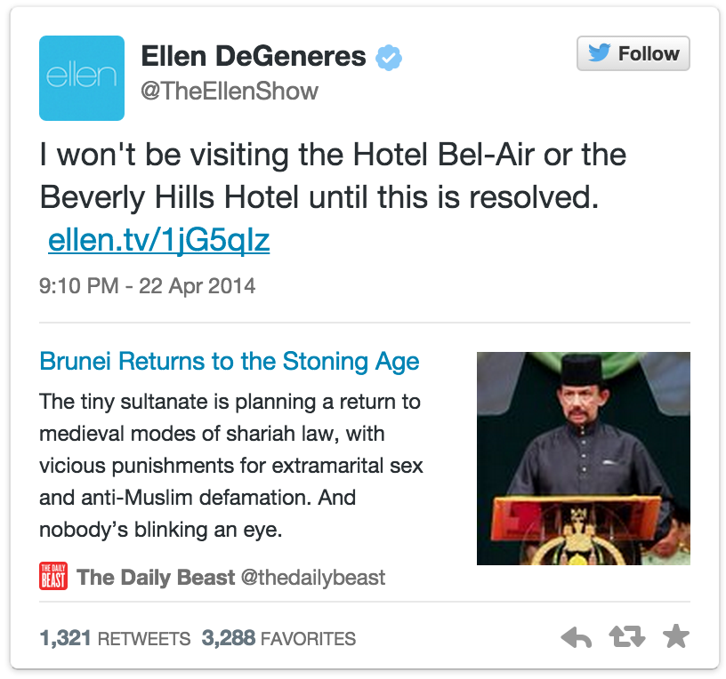 Der Sultan von Brunei hatte im vorangegangenen Oktober angekündigt, dass er in seinem Heimatland die Scharia einführen wird. Homosexualität kann in Brunei demnach mit dem Tode bestraft werden.