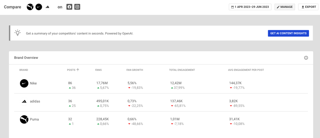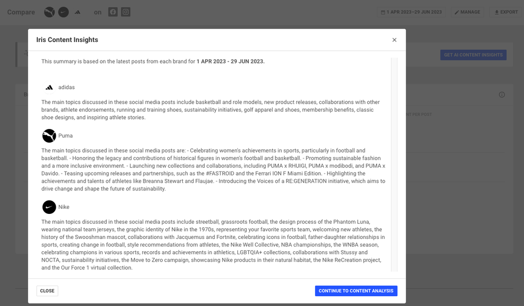 Für umfassendere Einblicke können Marketer:innen weitere Marken hinzufügen, um einen Überblick über die Content-Strategien der Konkurrenz zu erhalten und die Gründe für ihren Erfolg zu identifizieren. Einer der größten Vorteile ist, dass Iris Content Insights Marketer:innen und Social-Media-Manager:innen Zeit spart.