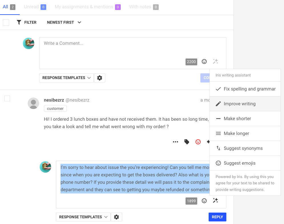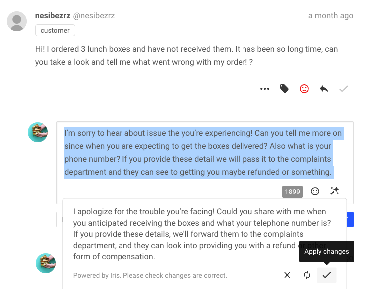 Wie funktionierts? Erstellen Sie zunächst eine Antwort auf die Nachricht Ihrer Kundschaft und nutzen Sie dann Iris, um den Text umzuformulieren, eine optimale Länge sicherzustellen, Rechtschreibung und Grammatik zu überprüfen und Varianten mit Emojis und Synonymen vorzuschlagen.