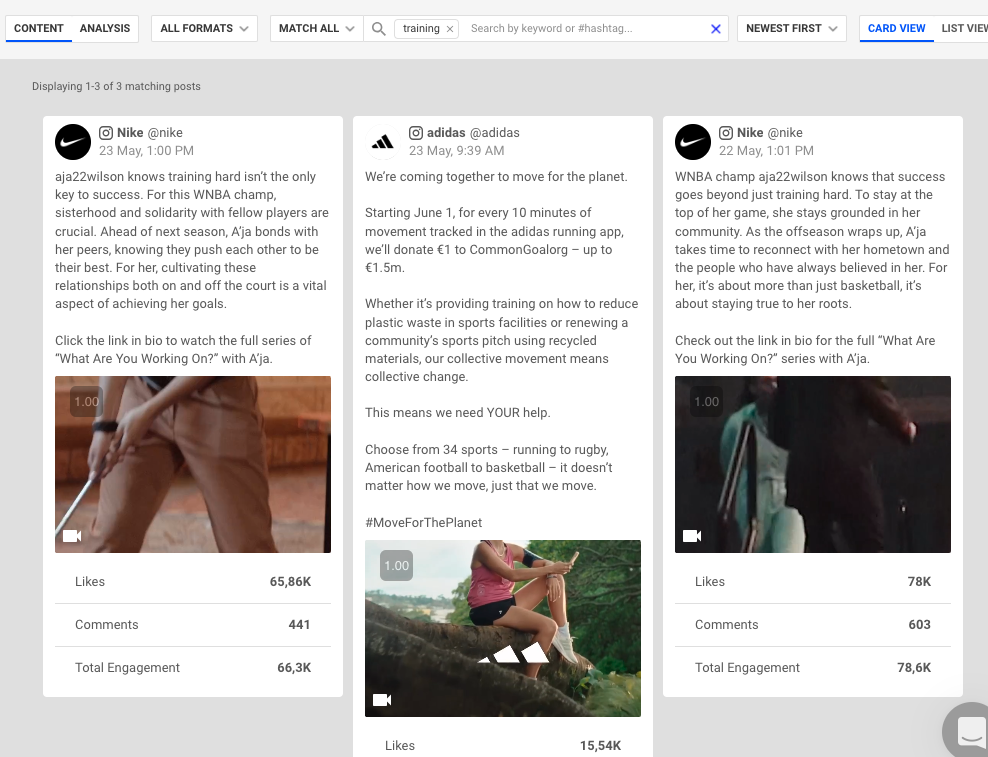 Als Beispiel haben wir uns drei Sportartikelmarken angesehen und in der Suchleiste des Dashboards nach „Training“ gesucht. In dem angegebenen Zeitraum haben zwei der drei Marken über Training gepostet, wobei Nike die Unterhaltung auf Instagram dominierte.