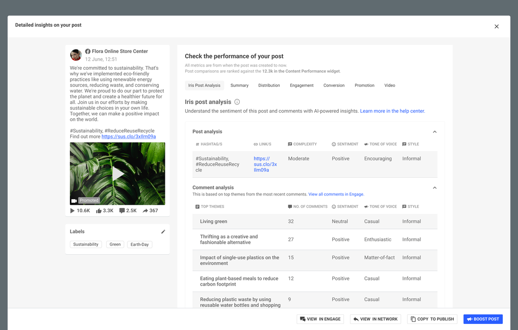 In Brandwatch Measure können Social-Media-Manager:innen ihre Social-Media-Analyse weiter ausbauen und mit Iris Post Analysis tiefere Einblicke in einzelne Beiträge erhalten.
