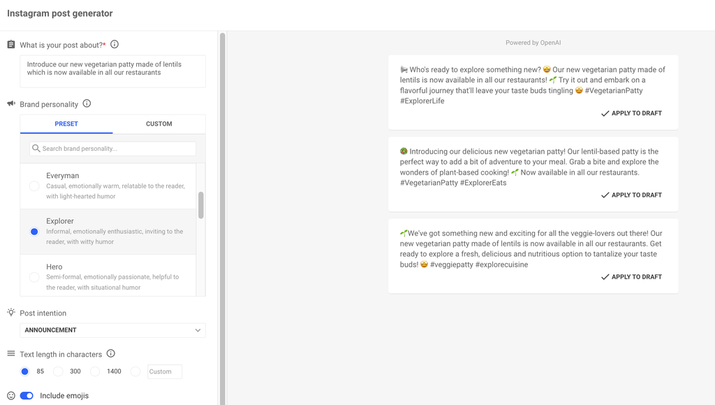 In Publish können Nutzer:innen den Iris Writing Assistant bitten, Texte für Beiträge von Grund auf zu erstellen, indem sie ihm einen Zusammenhang zum gewünschten Beitrag bereitstellen. Wenn Sie Iris detailliertere Richtlinien geben, können Sie den Tonfall bestimmen, indem Sie die Markenpersönlichkeit und die Absicht des Beitrags definieren.