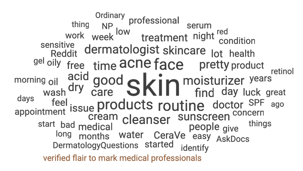 Wir haben die in r/SkincareAddiction geteilten Verbraucherempfehlungen analysiert. Nachdem Sie eine Query erstellt haben, können Sie die Konversation mithilfe einer Wortwolke visualisieren.